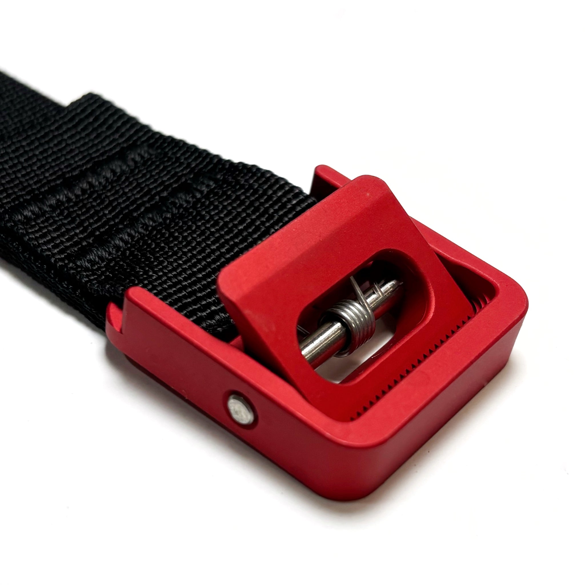 The CAM UTILITY STRAP features our 1" Cam Buckle. Weighing in at 11.25 grams, this CNC machined aluminum buckle is lighter than most plastic buckles. Unlike plastic, it is crazy strong and doesn't get brittle in the cold, and we think it's easier on the eyes as well.