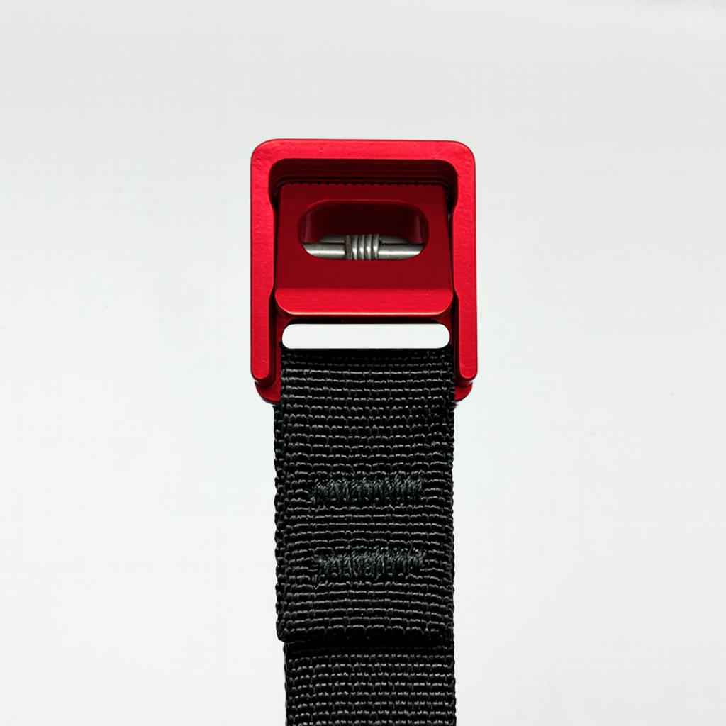 The Austere Cam Strap features our 3/4" Cam Buckle. Weighing in at 8.2 grams, this CNC machined aluminum buckle is lighter than most plastic side release buckles. Unlike plastic, it is crazy strong and doesn't get brittle in the cold, and we think it's easier on the eyes as well.